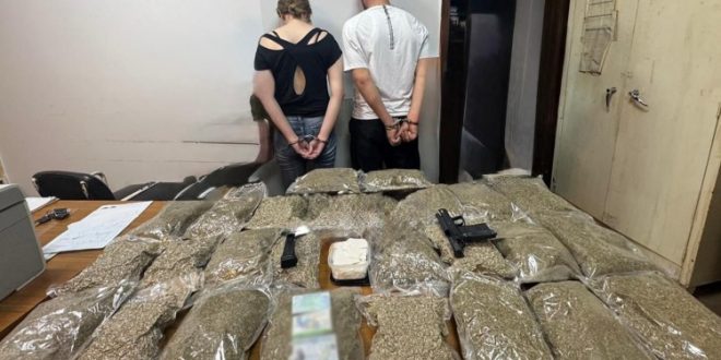 بتفتيشهما والسيارة، ضُبط معهما:/13/ كلغ من مادة السالفيا موضبة داخل /26/ كيسًا شفافًا، 285/غ من مادة الباز موضوعة داخل علبة بلاستيكية وحبوب مخدّرة ومسدس حربي مع ممشط و/12/ طلقة صالحة للاستعمال.