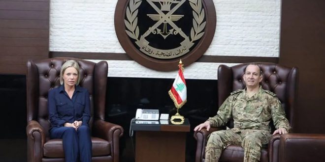 استقبل قائد الجيش العماد رودولف هيكل في مكتبه في اليرزة، المنسقة الخاصة للأمم المتحدة في لبنان Jeanine Hennis – Plasschaert، وتناول البحث الأوضاع العامة في لبنان والمنطقة.