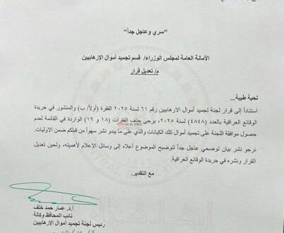 وجاء في بيان صادر عن لجنة تجميد أموال الإرهابيين في البنك المركزي العراقي: “إشارة إلى قرار لجنة تجميد أموال الإرهابيين رقم 61 لسنة 2025 والمنشور في جريدة الوقائع العراقية بالعدد 4848 في 17/11/2025 والمتضمن تجميد الأموال والأصول لقائمة من الكيانات والأشخاص المرتبطين بتنظيمي داعش والقاعدة الارهابيين بناء على طلب من دولة ماليزيا وإستنادا إلى قرار مجلس الأمن الدولي رقم 1373 لسنة 2001 وقد تضمنت هذه القائمة الإشاره إلى عدد من الأحزاب والكيانات التي لا ترتبط بأية نشاطات إرهابية مع التنظيمين المذكورين، وقد اقتصرت موافقة الجانب العراقي على إدراج الكيانات والأفراد المرتبطين بداعش والقاعدة حصراً وأن إدراج أسماء الكيانات الأخرى كان بسبب نشر القائمة قبل التنقيح وسيتم تصحيح ما نشر في جريدة الوقائع العراقية برفع تلك الكيانات والأحزاب من قائمة الكيانات المرتبطة بتنظيمي داعش والقاعدة الارهابيين”.